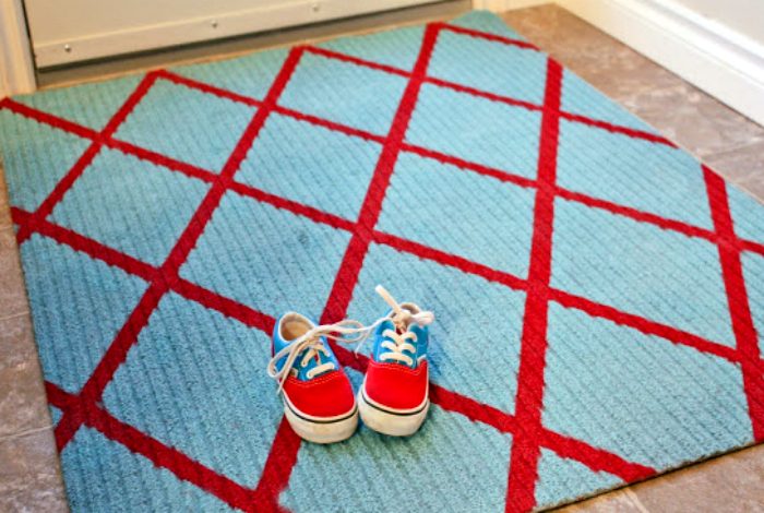 Преобразите скучный половик с помощью яркого полосатого принта, создать который можно с помощью малярного скотча и яркой аэрозольной краски.