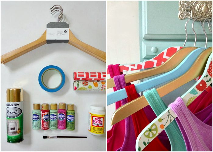 Преобразите деревянные вешалки с помощью цветного скотча или бумаги и клея. Яркие плечики будут радовать глаз и поднимать настроение всякий раз, когда их обладательница будет заглядывать глаз, а также станут отличным решением для открытого гардероба.