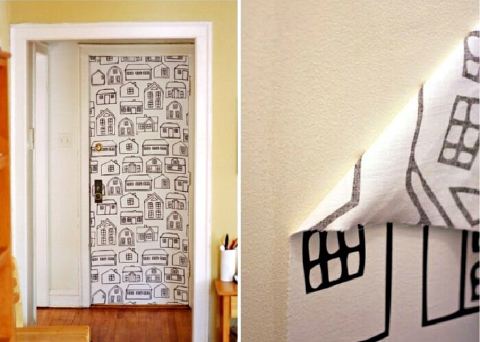 Украсить дверь детской можно с помощью тканевых обоев собственного дизайна. Реализовать эту идея не составит труда. Просто возьмите подходящий кусок белой ткани и разрисуйте ее незамысловатыми картинками в стиле примитивизм. К этому процессу также можно привлечь детей. Готовое полотно приклейте к двери с помощью клея из кукурузного крахмала. Преимущество такого декора в том, что когда рисунок надоест, обои можно будет легко снять и заменить на новые.