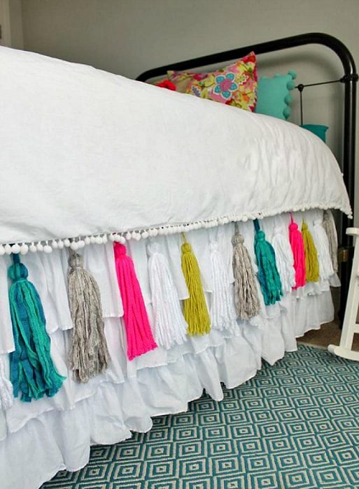 Оригинальная окантовка и яркие кисточки из цветных ниток станут оригинальным украшением скучного покрывала на кровать.