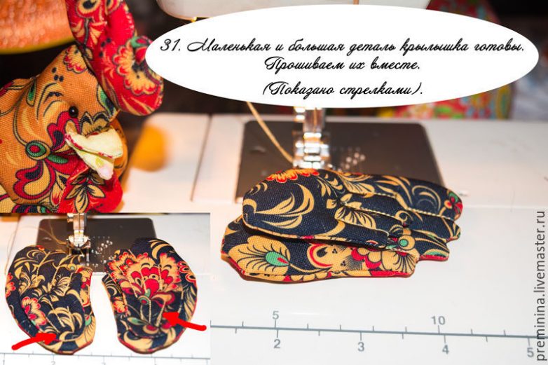 31. Маленькая и большая деталь крылышка готовы. Прошиваем их вместе (показано стрелками).