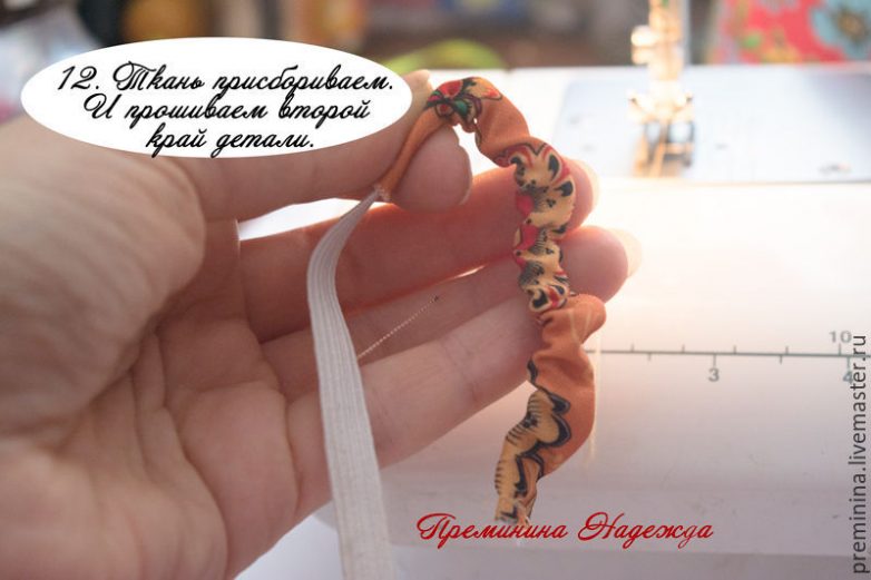 12. Ткань присбориваем. Прошиваем второй край детали.