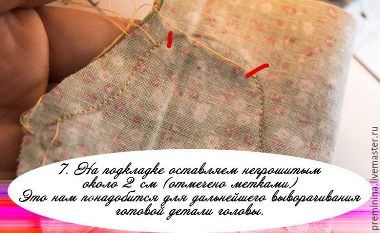 7. На подкладке оставляем непрошитым около 2 см (отмечено метками). Это нам понадобится для дальнейшего выворачивания готовой детали головы.