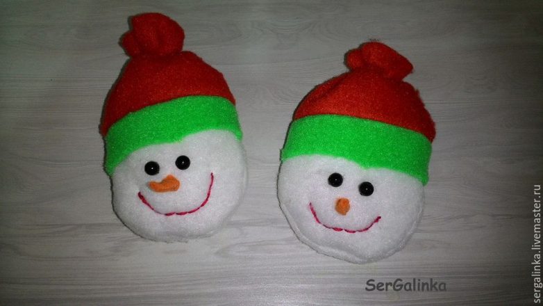 Завязываем шарфик на узел и приклеиваем к мешку и голову и шарфик. Декорируем мешочек и снеговушу по своему вкусу.