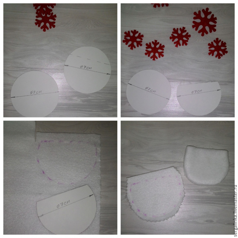 Делаем выкройку головы снеговика. Циркулем чертим круг диаметром 7 см сверху отмеряем 1,5 см проводим линию и отрезаем. Переносим выкройку на белый флис. Нам нужно две детали. Складываем лицевой стороной вовнутрь и стачиваем детали по незамкнутому кругу, то есть вверху не прострачиваем. Делаем надрезы и выворачиваем.
