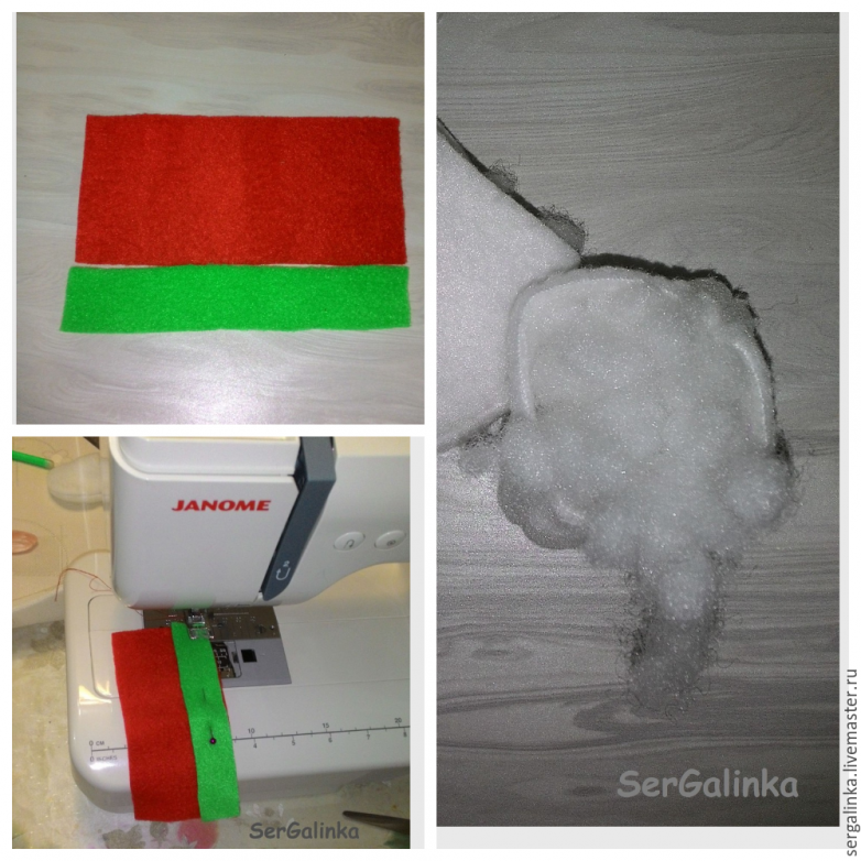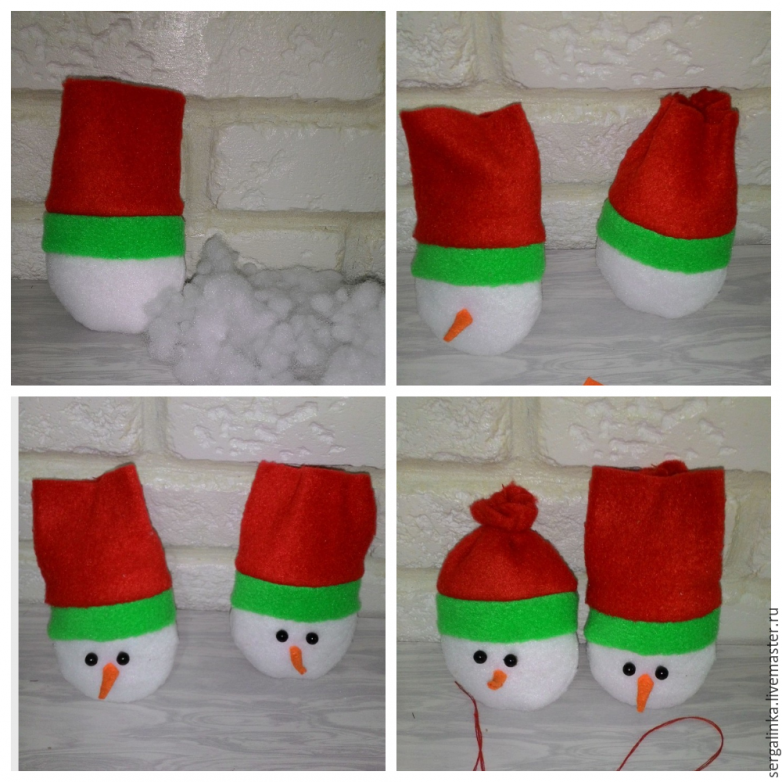 Сострачиваем элементы шапки. Набиваем голову снеговика наполнителем.