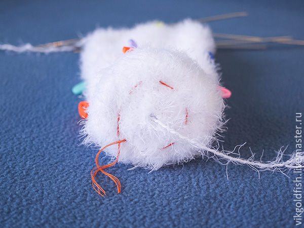 Набить до конца, нить обрезать, продеть через оставшиеся петли, стянуть, закрепить, кончик нити спрятать.