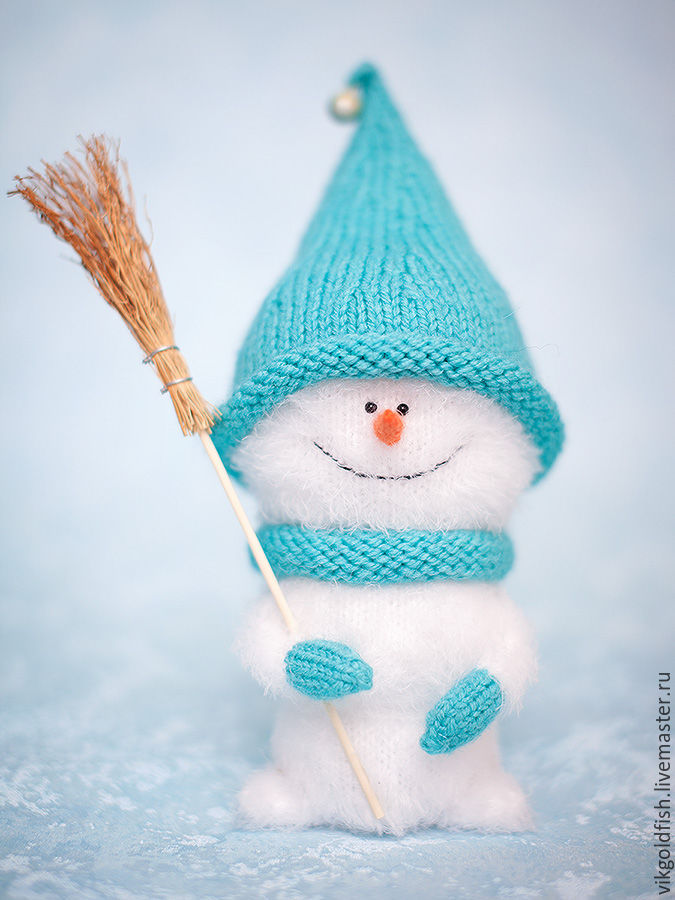 По пряже — так как этикетки всегда выкидываю, могу только сказать, что для тела использовала пряжу средней толщины, для носа — потоньше, для варежек и шапочки — толстую. Спицы, соответственно, тоже подбирались по толщине пряжи.