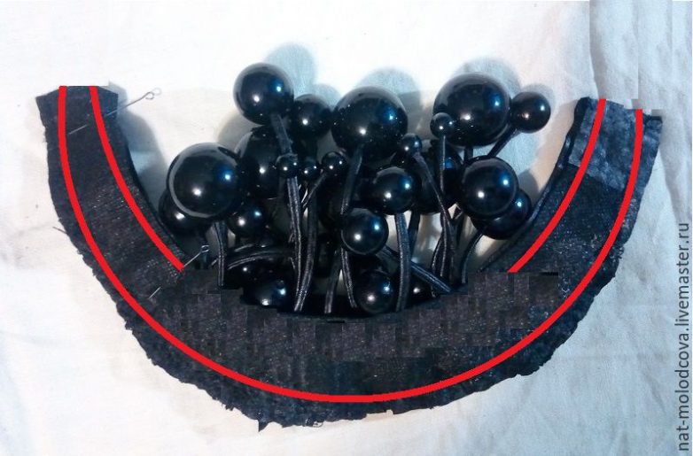 Вырезаем его и обводим по контуру на втором листе бумаги. Потребуется два макета: один нарисованный на листе — для формирования украшения перед сборкой, второй вырезанный — для выкраивания кожи. К макету, нарисованному на листе прикалываем булавками шнуры с нанизанными бусинами по нижнему контуру ожерелья, распределяя шарики «по вкусу». Смотрим, где «не хватает». По второму макету (лекалу) вырезаем две детали из кожи с припусками на шов 4-7 мм.