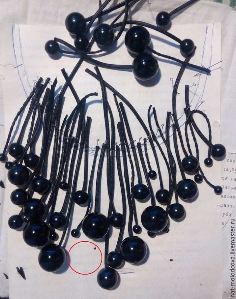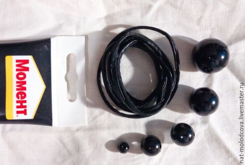 Нарезаем шнур, кончик срезаем наискосок, чтобы легко прошёл в бусину, нанизываем сразу все шарики так, чтобы конец шнура на 2-3 см выглядывал. На кончик шнура наносим немного клея, продвигаем бусину, чтобы конец шнура оказался внутри шара и не выглядывал. Излишки клея стираем сразу.