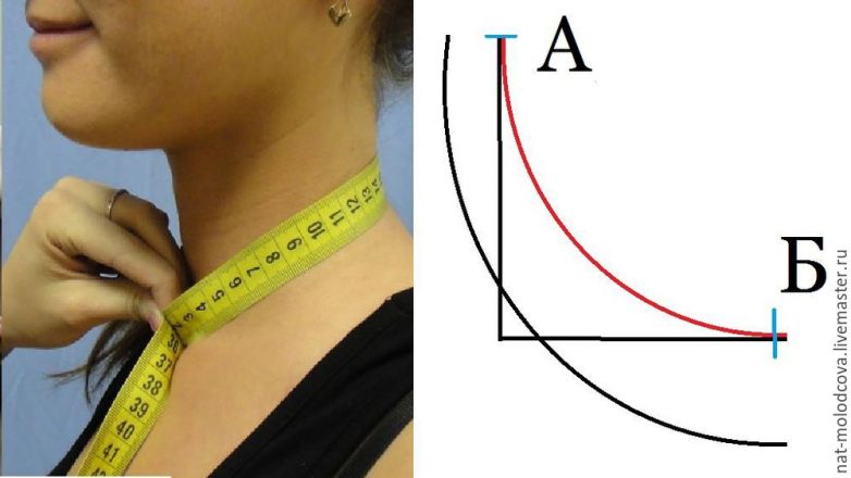 Рисуем макет колье-оплечья на листе бумаги (в данном случае оно идёт через всю переднюю часть шеи). Измеряем обхват шеи через 7-й шейный позвонок, по точкам основания шеи и замыкаем над ярёмной ямкой. Делим эту величину на 6 и рисуем квадрат со сторонами, равными полученной величине, отмечаем точки А и Б. между ними циркулем проводим часть окружности. Это линия прилегания к шее. Вторую окружность большего радиуса провидим, отступив от точек А и Б 1,5 и 3 см соответственно. Это линия внешнего контура. Деталь вырезаем симметрично относительно перпендикуляра из точки Б. Получилось лекало деталей в готовом виде.