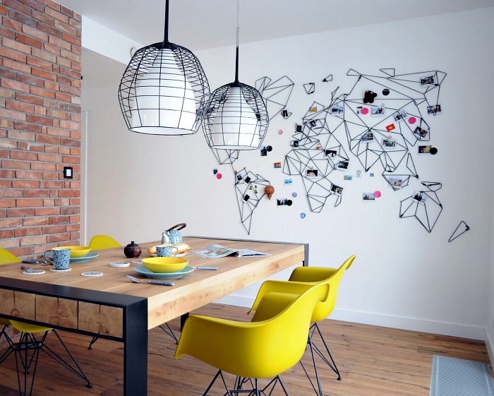 Самые смелые и творческие личности могут попробовать украсить одну из стен своей квартиры стильной картой мира в технике стринг арт.