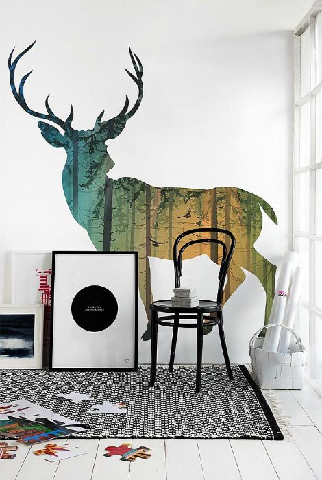Оригинальная наклейка, фотообои или крупное изображение оленя, заказанное в типографии, станет потрясающим украшением однотонной стены и привнесет в помещение положительную энергетику.