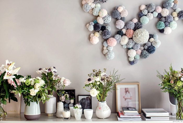 Преобразить скучную стену можно с помощью цветных помпонов, сделанных из остатков пряжи.