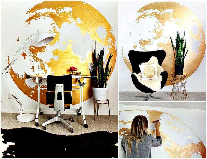 Огромное изображение луны, нарисованное при помощи кистей и жидких золотых красок, станет неповторимым украшением белой стены, сделает интерьер невероятно стильным и привнесет в помещение нотки таинственности.