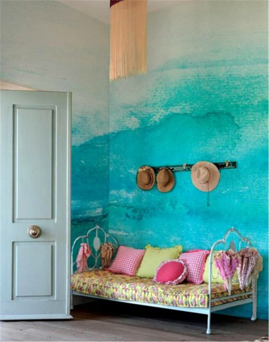Акварельная краска для стен — настоящая находка для дизайнера. Она легко наноситься, отлично смешивается, а растекаясь, создает волшебные декоративные эффекты. Например, вооружившись красками, валиком и несколькими кисточками можно создать на пустующей стене акварельный рисунок с популярным эффектом омбре.
