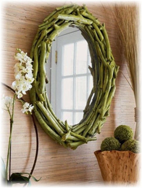 Это декоративное зеркало, также очень легко сделать. Материалы, которые будут нужны, различные сухие ветки или коряги, садовые ножницы, зеленая краска, клей и зеркало. Разрежьте ветки или корягу на мелкие кусочки и нанести на них несколько слоев краски. Затем приклейте ветки к зеркалу.