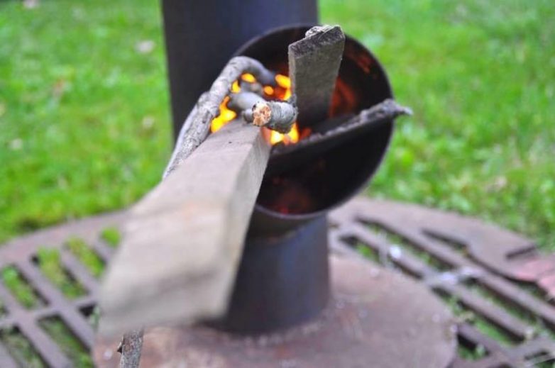По одной трубе жар будет подниматься вверх, в то время как через другую можно будет подбрасывать дрова, валежник, газеты и прочее топливо.