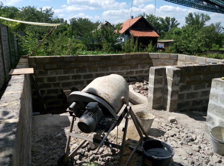 Очень выручает бетономешалка подаренная мне другом 5 лет назад. Простояла без дела, а теперь она главный персонаж стройки.