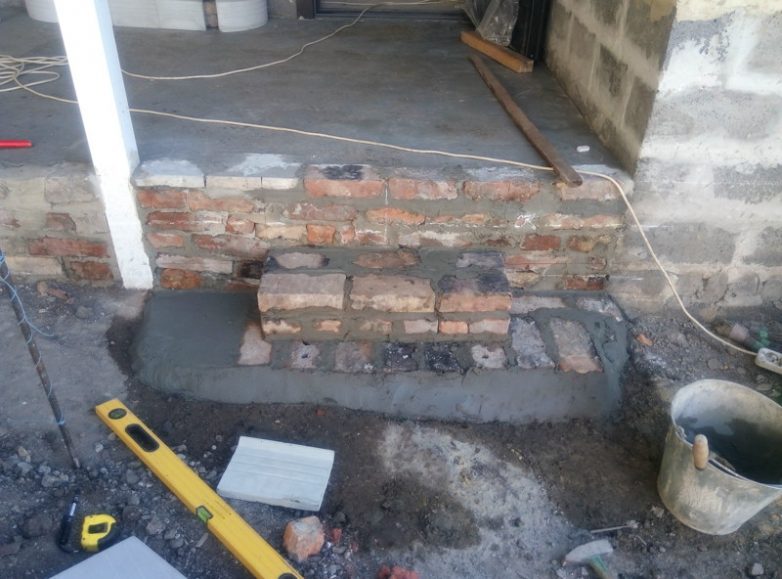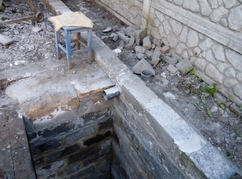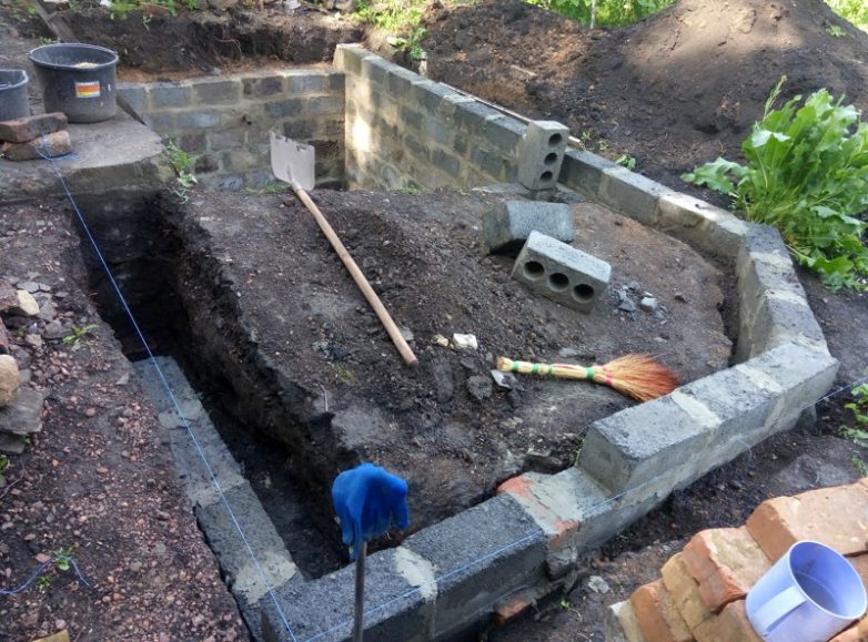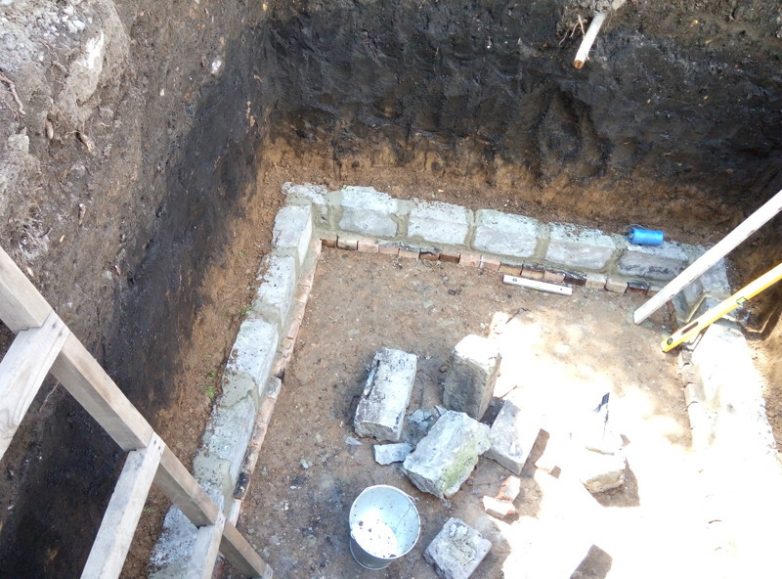 Вид с другой стороны. Обратите внимание на пластиковую трубу вложенную в кладку. Это элемент вентиляции погреба, свежий воздух будет приходить с улицы через эту трубу до самого пола погреба, а с противоположной стороны (там тоже видна труба) будет выходить с потолка погреба по трубе вдоль стены здания снаружи вверх. Будет естественная вентиляция.