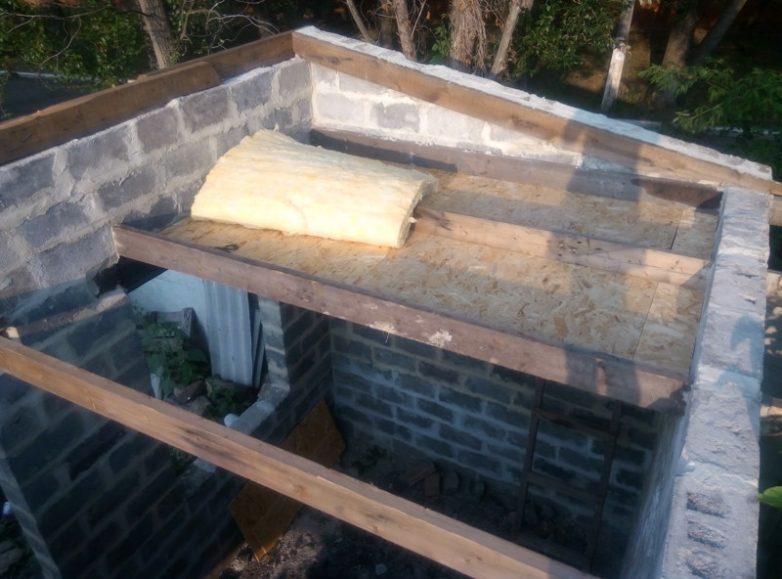 Целый день ушёл на вход в погреб. Снизу шпалы подбил остатками бруса толщиной 50мм. Сверху наложил пустых мешков, которые остались от цемента, потом засыпал строительным мусором, потом слой целлофана и заливка бетоном.