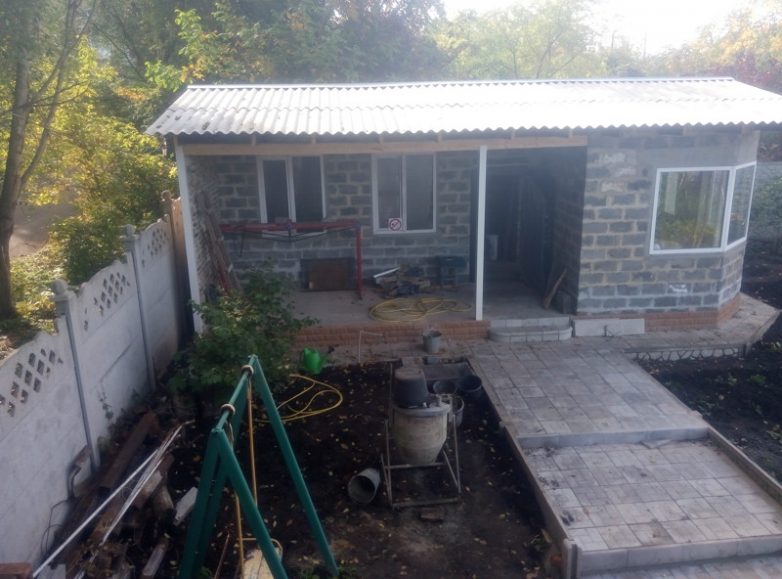 Аппендицит достроен и пристыкован к фундаменту сарая. На 10 см не совпал уровень, но ничего страшного. Лозунгом нашей стройки была фраза: " Следующим рядом всё выровняем!".