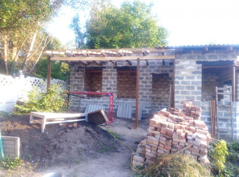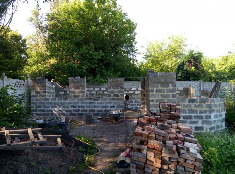 Поднимаемся в высоту. Уже куплены окна. Строим проёмы. На ночь передали дождь. Укрываю кладку всем подручным мусором. Обратите внимание на две кучи чернозёма с боков, это из погреба, потом они удачно пригодятся.