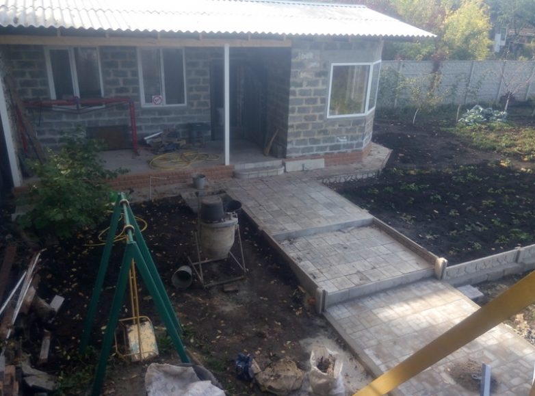 Весь чернозём перетаскал жене в огород, заодно его немного спланировал, а то раньше был уклон, досыпал пол метра в высоту! Ещё 2 дня ушло на облицовку фундамента керамзитовой плиткой.