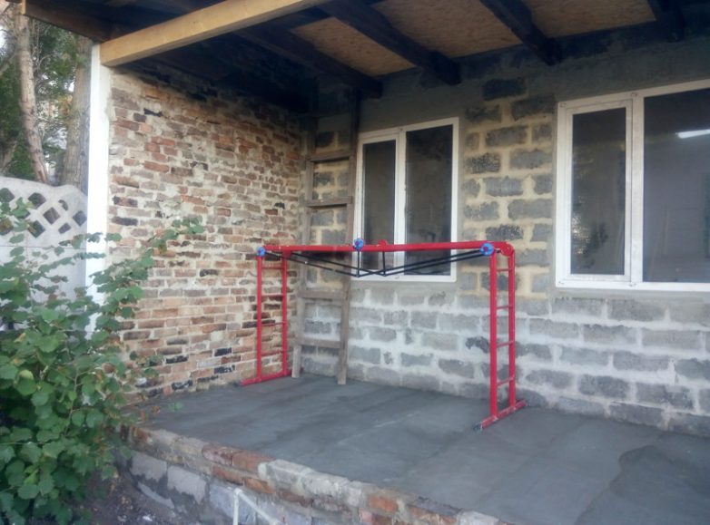 Случайным образом на стройке появилась лестница. Дивная штука! Цена всего 40$, а трансформируется во что угодно. Можно стремянку, можно леса, можно просто лестница 4,8м высоток. Очень выручает.