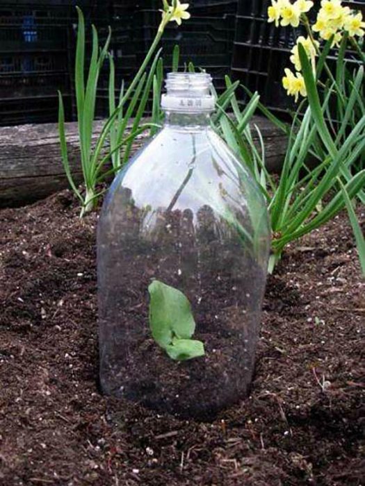 Мини парник, который можно сделать из обычной пластиковой бутылки, просто отрезав от нее дно. Такая теплица лучше всего подойдет для огурцов и кабачков так, как эти растения плохо переносят пересадку и много сил тратят на адаптацию. В начале высадки колпак должен быть прикрыт крышкой позднее, когда дневная температура достигнет двадцати градусов, крышку следует снять, а позже и вовсе убрать бутылку.