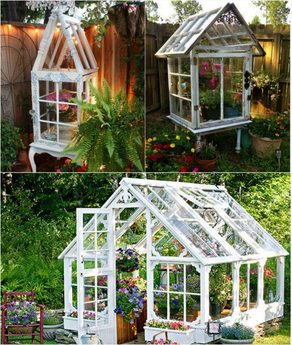 Из оконных рам можно возвести очаровательные домики, которые помогут не только обеспечить растениям комфорт, но и станут потрясающим украшением дачного участка.