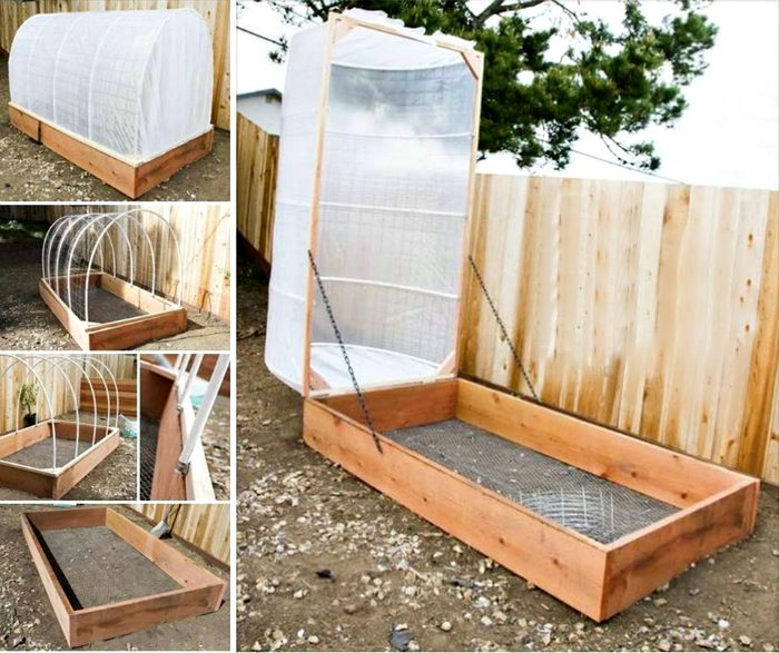 Небольшая теплица, для создания которой потребуется деревянная рамка желаемого размера, две тонкие пластиковые трубы и кусок клеенки. Прелесть такой конструкции в том, что когда растения окрепнут, а ночная температура поднимется, клеенку можно будет легко снять и тем самым превратить парник в аккуратную клумбы.