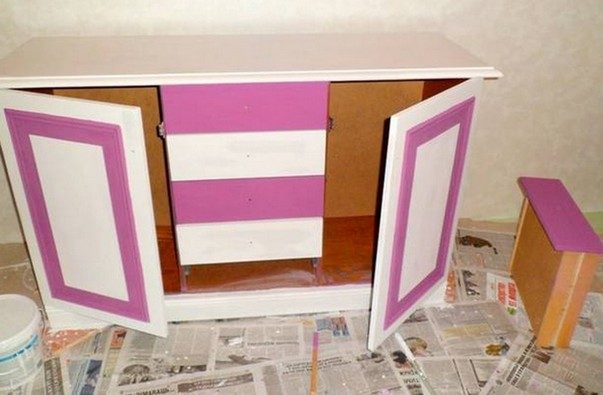 Теперь комод покрываем белой акриловой краской. А ящики чередуем белым цветом и черничным. При помощи малярного скотча на дверках выделяем рамки и закрашиваем их черничной краской, в эти рамки мы прорисуем силуэты женщин.