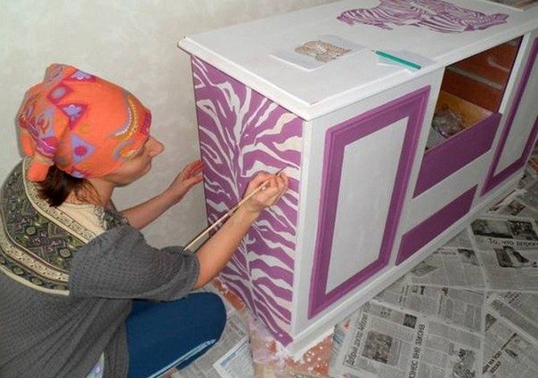 Поскольку комод будет в африканском стиле, то боковые стенки можно разрисовать зебровым принтом. Для этого включаем фантазию, запасаемся терпением, берем в руки кисть с черничной краской и творим! Автор нарисовала зебр и на крышке комода.