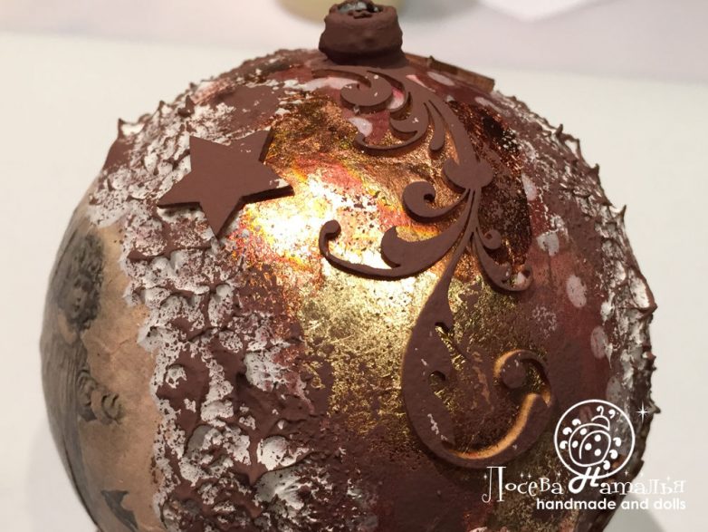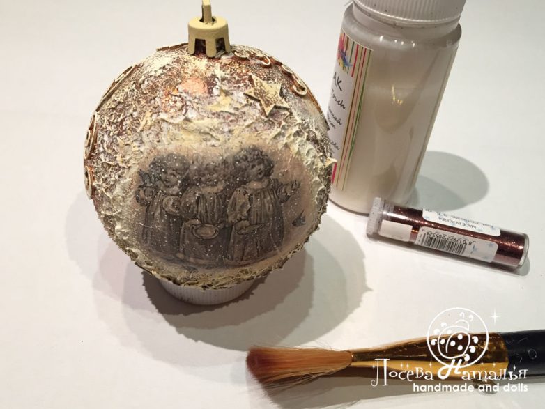 12. Надеваем хвостик-держалку, красим ее. Готовим сразу акриловый матовый лак и глиттер шоколадного цвета. Наносим лак и сразу, как солью, посыпаем шарик глиттером и оставляем сушить. К сожалению, фотографии не смогли передать в полной мере сочетание винтажной матовости и праздничного блеска глиттера.