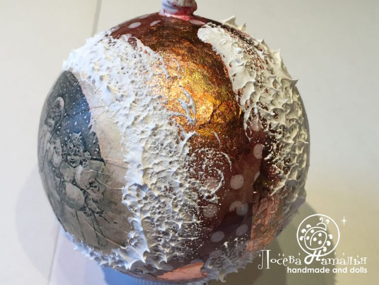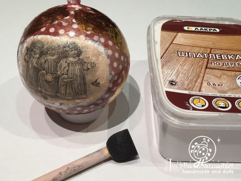 8. Просушиваем шар и создаем фактуру на его поверхности с помощью шпатлевки и спонжа.