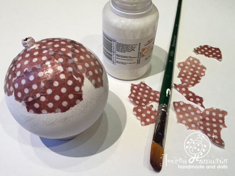 2.Декупажную карту рвем на небольшие элементы. После того как шарик высохнет, оклеиваем его кусочками. Шарик перед оклеиванием шкурить не обязательно, тем фактурнее будет поверхность.