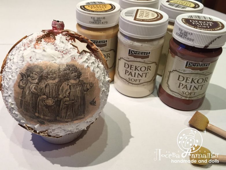 11. Теперь начинается самое интересное. Работа с акриловыми красками. Выбираем цвета, подходящие под фон шарика и распечатки и начинаем поочередно наносить спонжем цвета от самого темного к самому светлому.