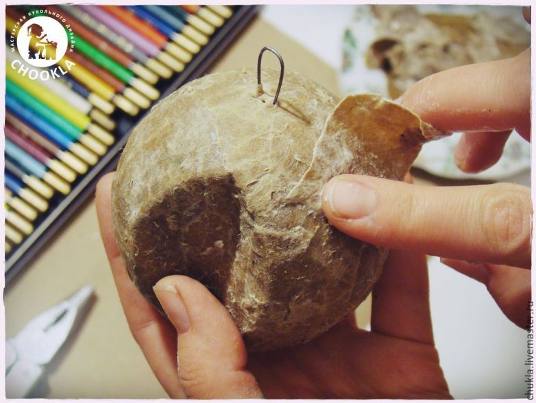Получившийся усечённый шар, с тремя проволочными петельками, обложила пятью слоями папье-маше.