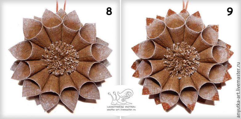 2) Между половинками каждого цветка вклеиваем кончик отрезка джутового шпагата.