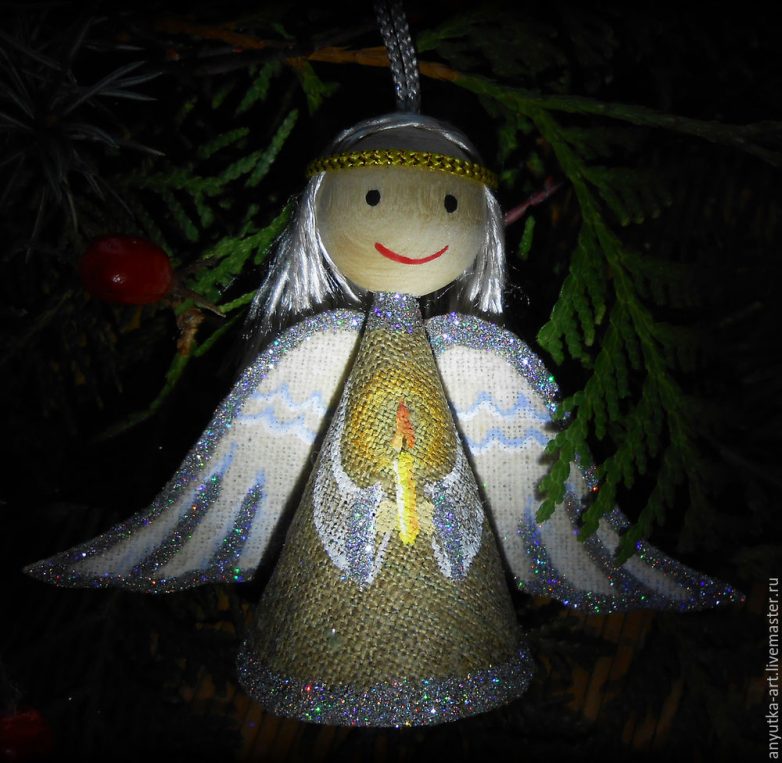 Свои игрушки я украсила блестками, так как хотела сделать их именно новогодними, праздничными, нарядными. Но, конечно, оформить их можно по-разному. Например, красиво сочетаются лен и хлопковое кружево. Из кружева можно сделать серединки цветов, украсить одежду ангела. Очень нежно смотрятся на таких украшениях бусины под жемчуг. Любители экостиля могут декорировать игрушки деревянными пуговицами и бусинами. Серединки цветов можно сделать из джутового шпагата, использовать в отделке природные материалы, например шишки ольхи, маленькие веточки туи и т. п. Вариантов много!