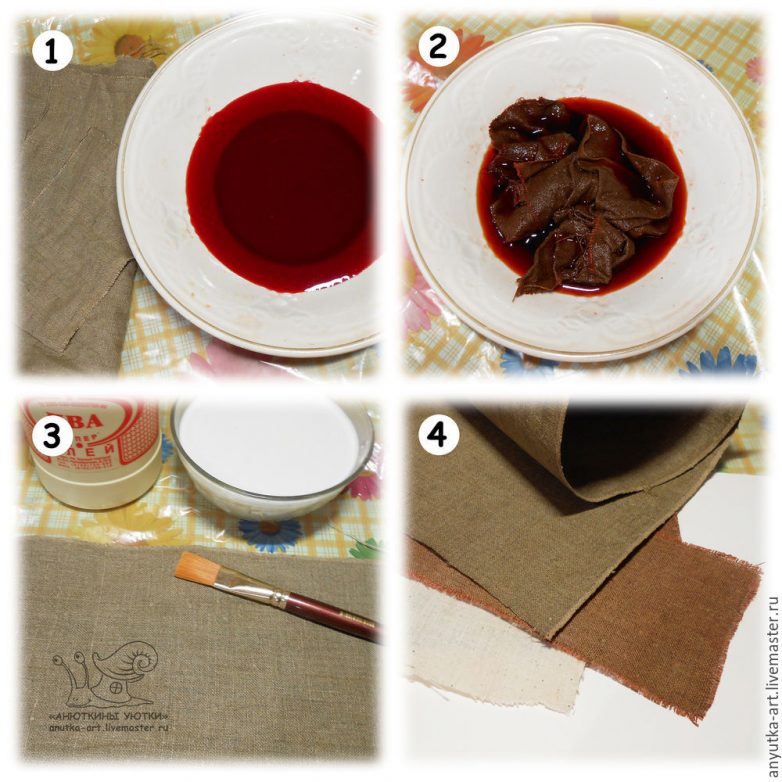 На фото 4 уже готовые лоскуты. Использование красной пищевой краски в сочетании с первоначальным цветом льна дало красно-коричневый оттенок. Получилось очень похоже на результат окрашивания натуральными красителями. Мне понравилось.