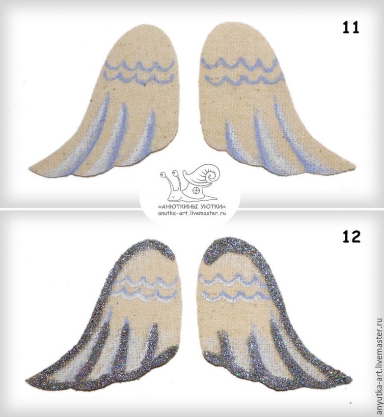 11) Смазываем лаком края крыла и нижние перья. Обсыпаем блестками (фото 12).