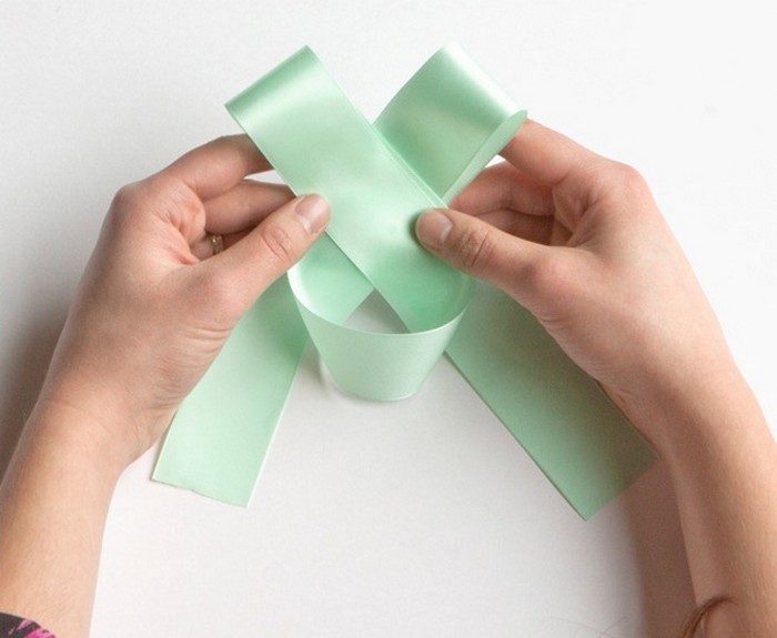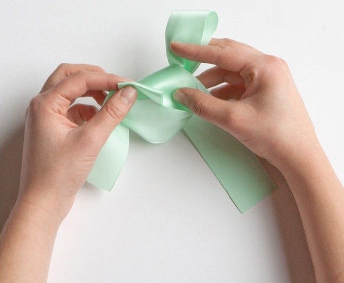 Шаг 1: возьмите ленту и, мысленно разделив её пополам, сложите каждый конец в петлю (недаром на Западе из-за формы петелек этот бант ласково называют «ушки кролика»).