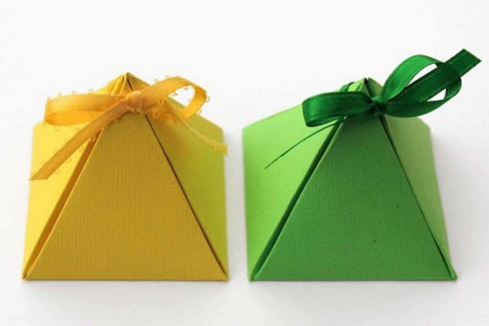 Просто вырежьте квадрат из картона или плотной бумаги и сложите его симпатичной пирамидкой. Отлично подходит для небольших подарков.
