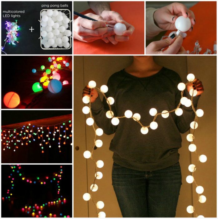 Лампочки старой наскучившей гирлянды можно украсить простыми теннисными шариками, что позволит ей засиять совершенно новым светом.