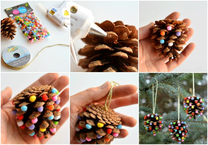 Немного маленьких цветных помпонов, клей, и золотистые веревочки позволят превратить шишку в необычное елочное украшение.
