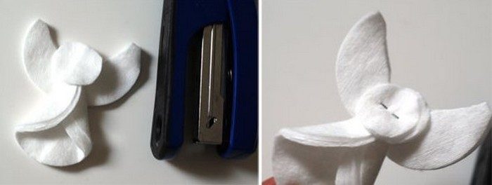 Каждый ватный диск складывайте треугольником и закрепляйте один угол степлером. Затем сшейте их в плотную «гроздь», придайте дополнительный объём руками и приклейте (или пришейте) петельку. В среднем на одну игрушку уходит 15 дисков. Такие ёлочные шарики точно не разобьются. А ещё ими можно играть в «снежки» прямо дома.