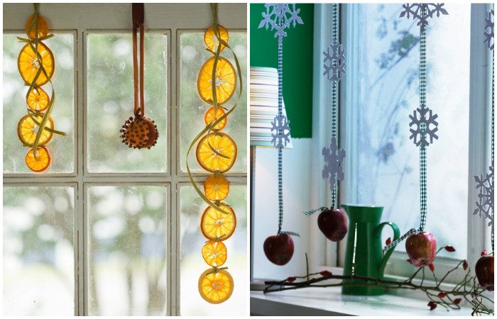 Для изготовления новогоднего декора для окон можно использовать любые фрукты – апельсины, мандарины, яблоки. Такая гирлянда будет радовать не только нестандартным видом, но и приятным ароматом.