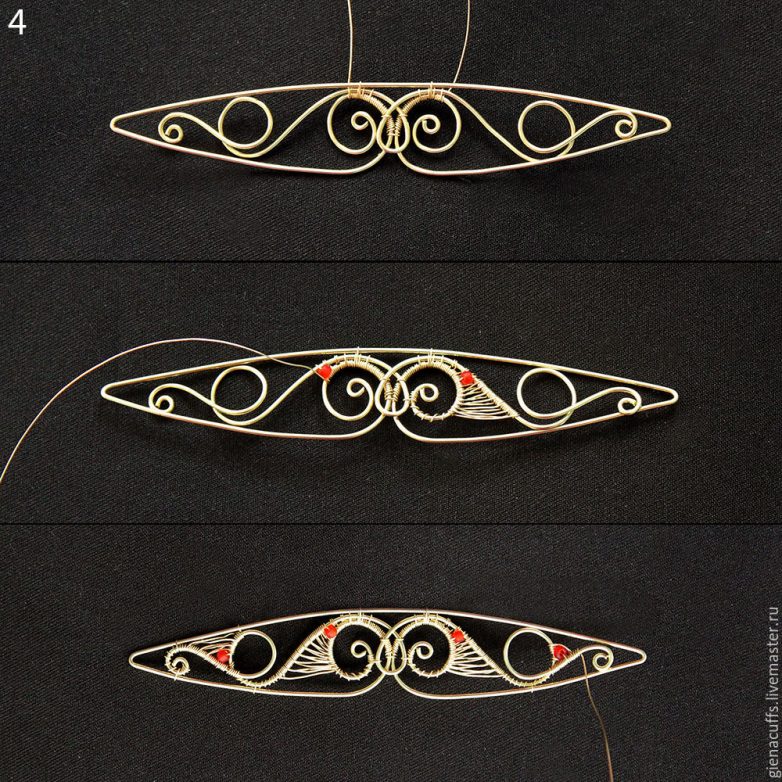 4) Соединяем два полученных элемента, используя проволоку 0,3 мм. На этом этапе я добавила несколько красных бисеринок в наш узор.